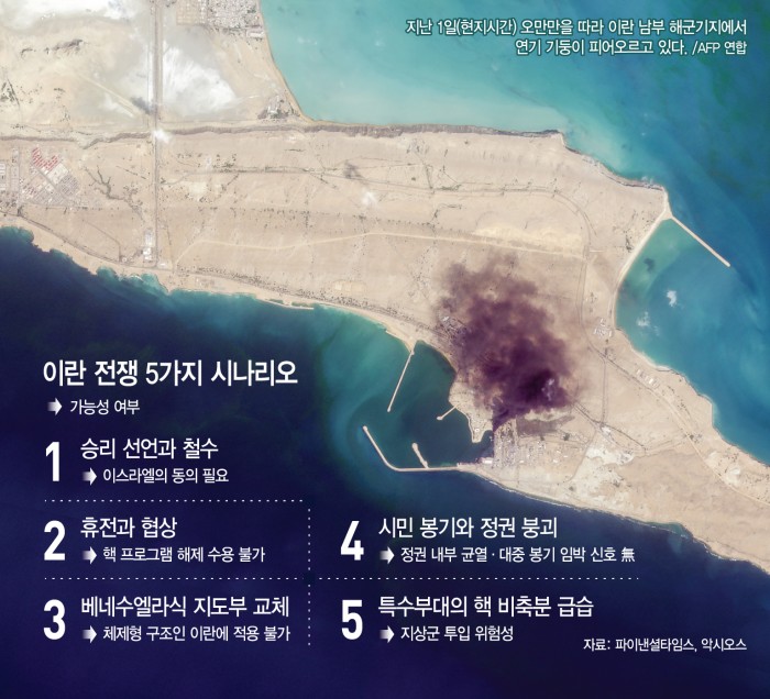 이란 전쟁의 결말은 여전히 안갯속이다. 영국 일간 파이낸셜타임스(FT)는 10일(현지시간) 전쟁이 전개될 다섯 가지 종전 시나리오를 제시하며 '트럼프